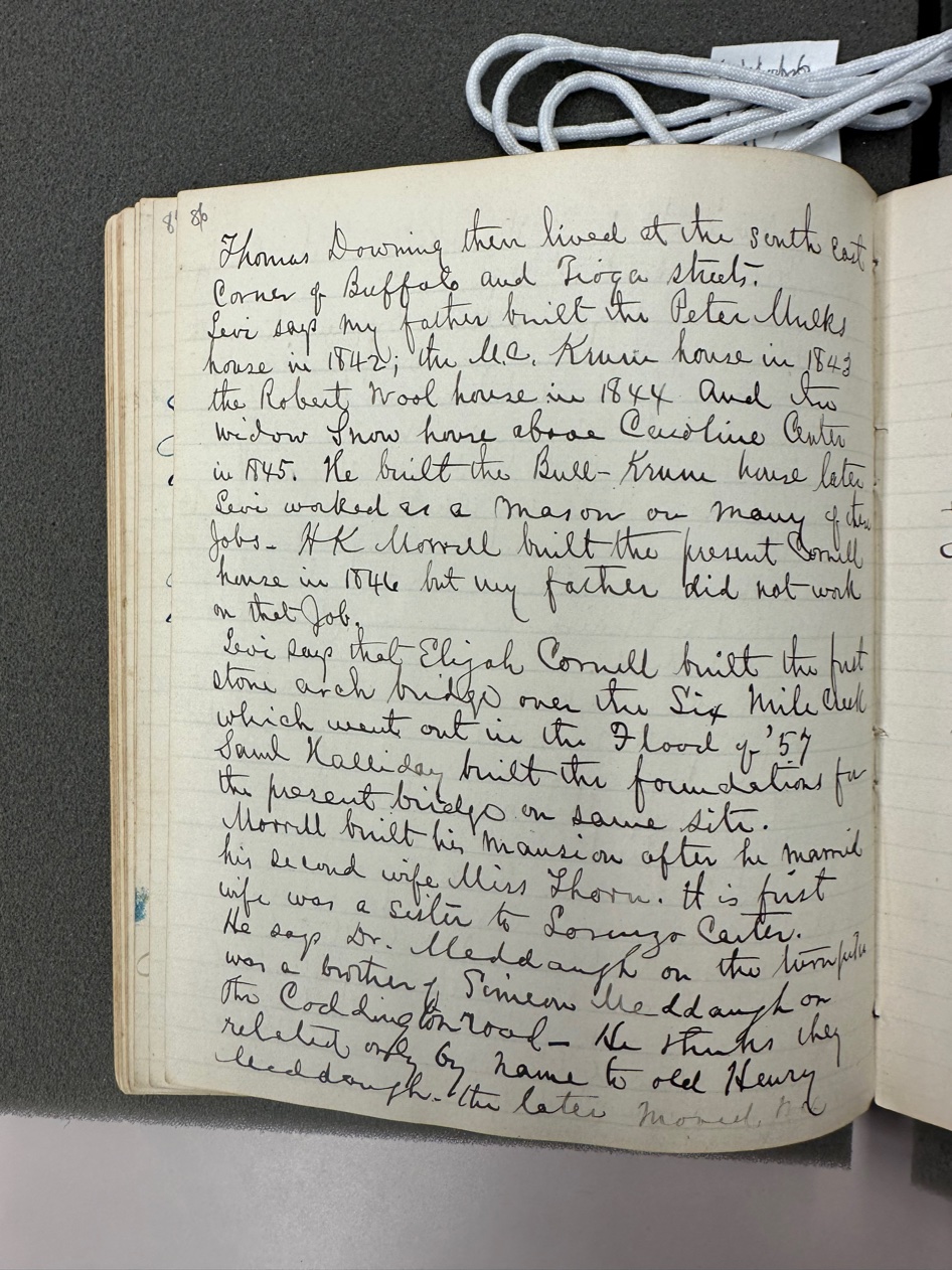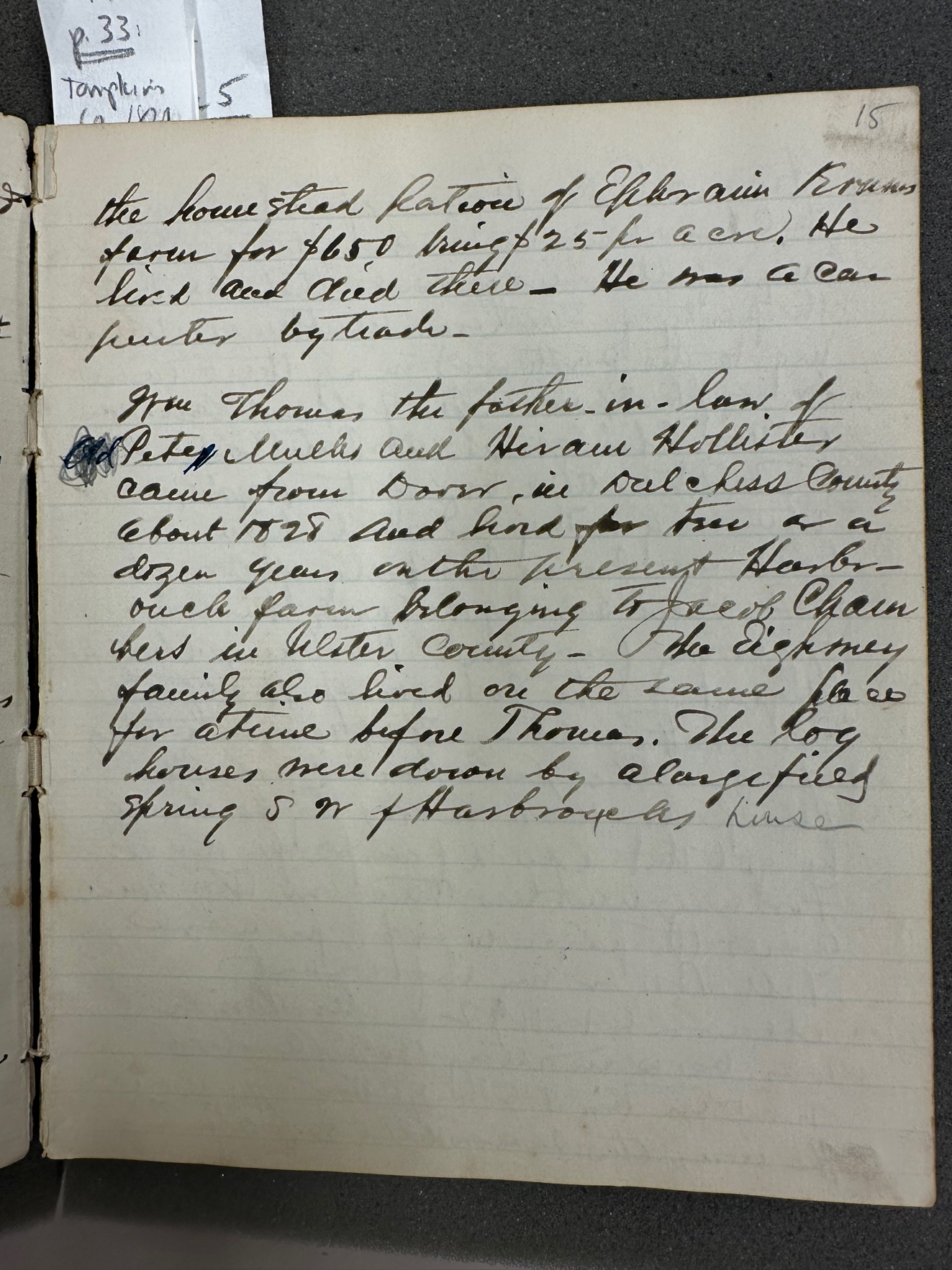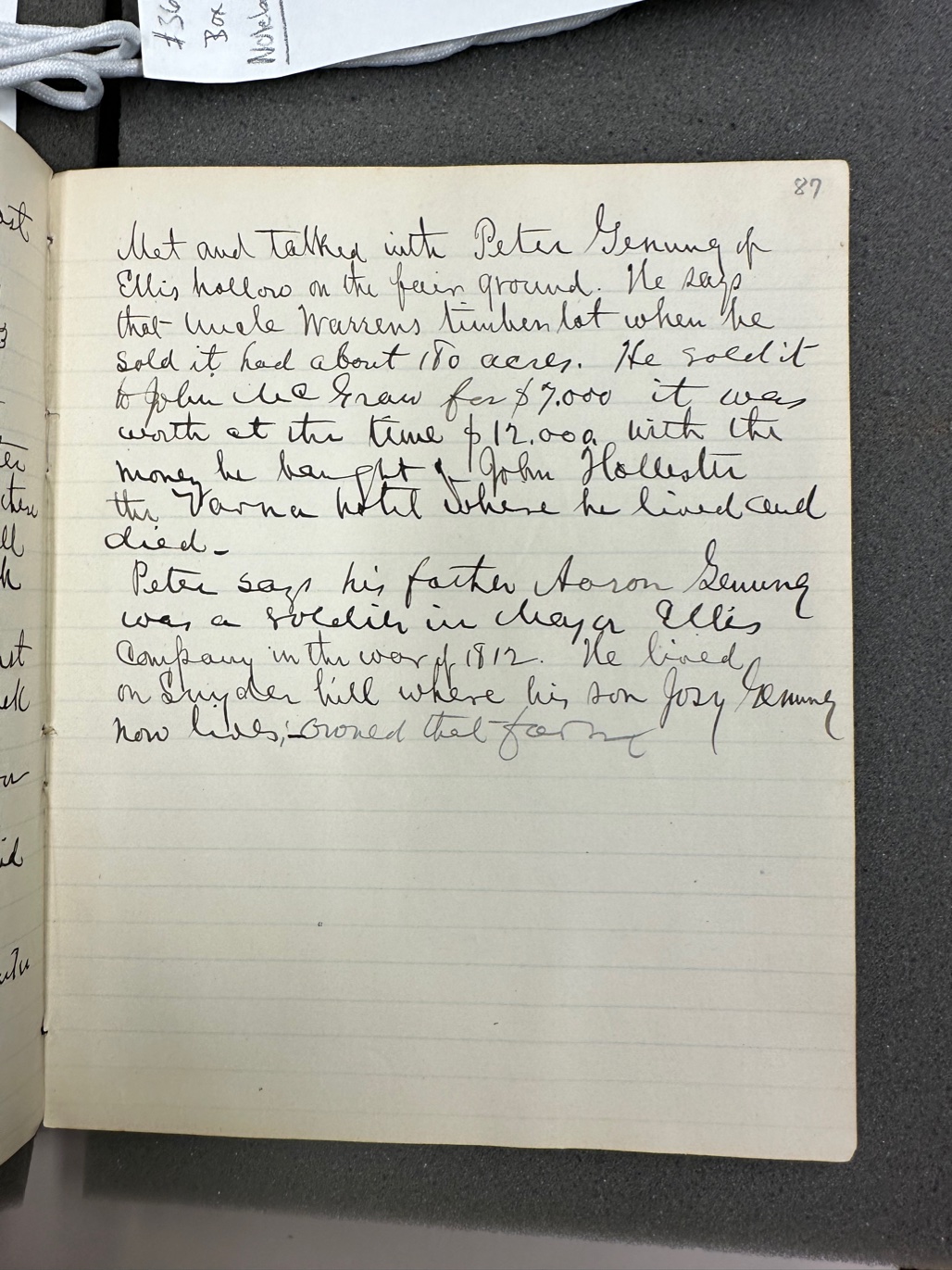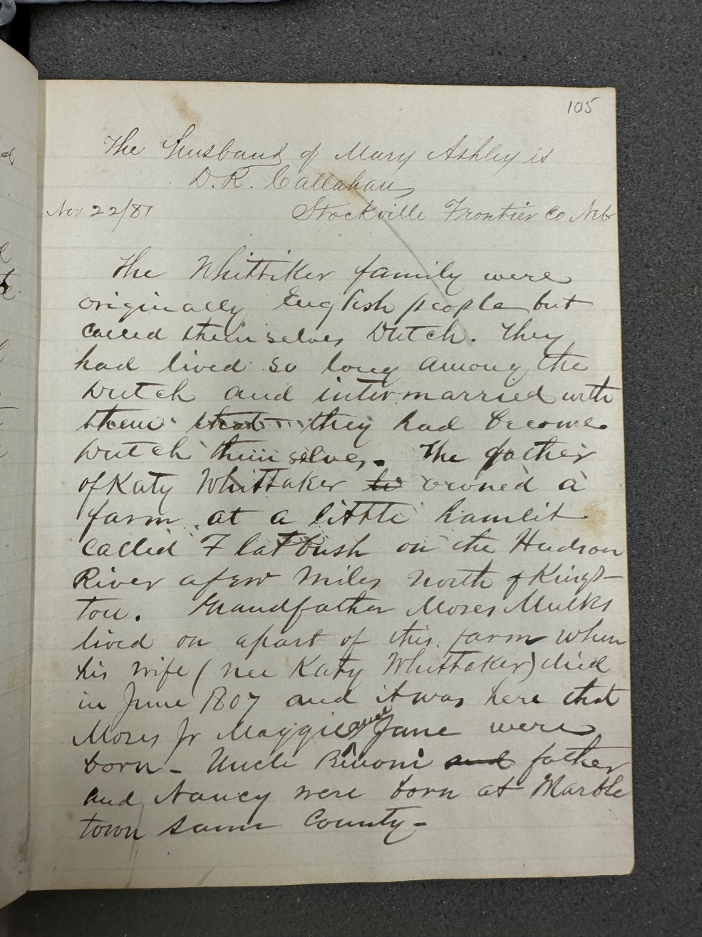 The father of Dennis Babcock was Caleb Babcock. He owned a large farm where Wessel Meddaugh now lives but having a bad title was obliged to relinquish it and give up the land. He supposed he had it all paid for + was out of debt. He died poor. Judge John Ellis afterward owned it and lived there for a time. Henry Krum told me this 12/17/81