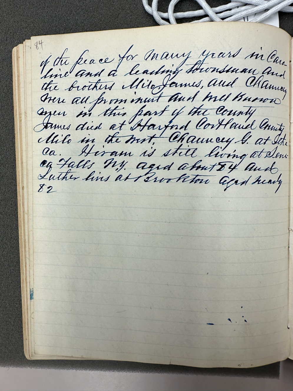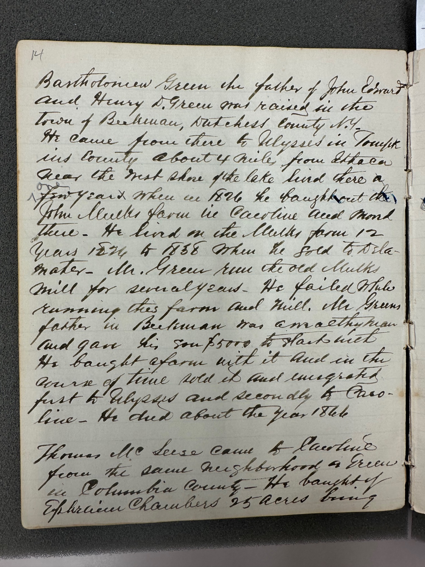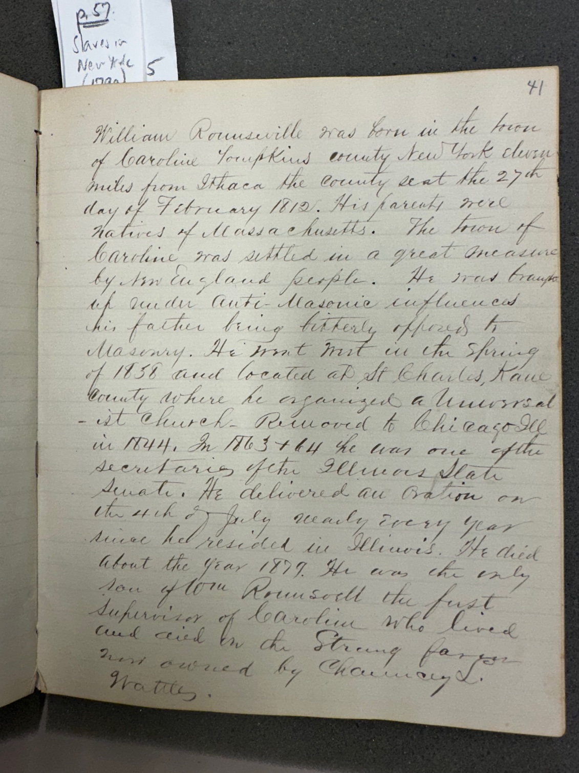 William Rounsville was born in the town of Caroline Tompkins county New York eleven miles from Ithaca the county seat the 27th day of February 1812. His parents were natives of Massachusetts. The town of Caroline was settled in a great measaure by New England people He was brought up under anti-Masonic influences his father being betterly opposed to Masonry. He went west in the spring of 1838 and located at St Charles, Kane County where he organized a Universalist Church. Removed to Chicago Ill in 1844. In 1863 + 64 he was one of the secretaries of the Illinois State Senate. He delivered an oraton on the 4th of July nearly every year since he resided in Illinois. He died about the year 1877. He was the only son of Wm Rounsvell the first Supervisor of Caroline who lived and died on the Strang farm now owned by Chauncey L. Wattle.