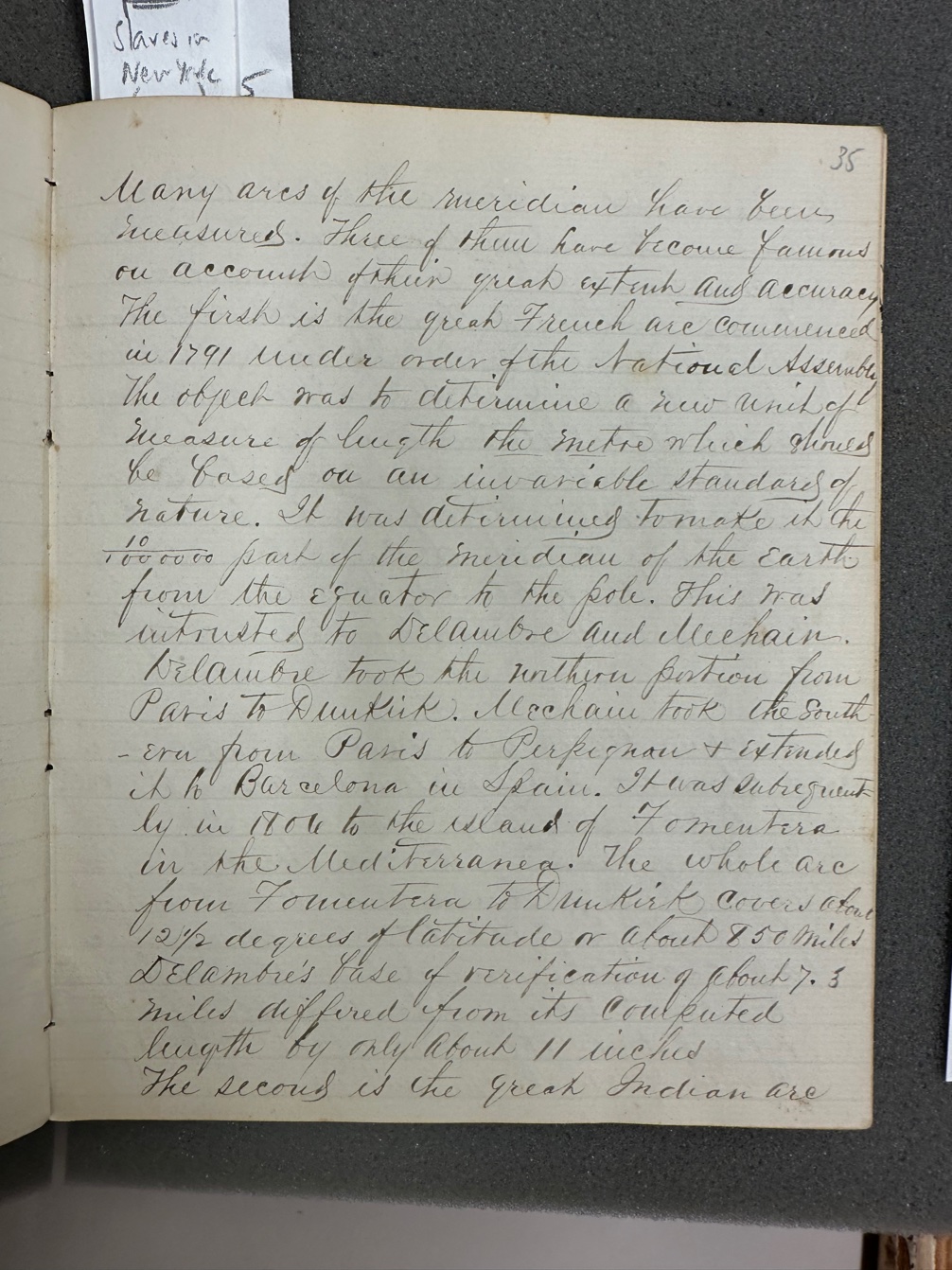 Many arcs of the meridian have been measured. Three of them have become famous on account of their great extend and accuracy. The first is the great French arc commenced in 1791 under order of the National Assembly. The object was to determine a new unit of measure of length the metre which should be based on an invariable standard of nature. It was determined to make it the ¹⁰⁄₁₀₀₀₀₀₀ part of the meridian of the earth from the equator to the pole. This intrusted to Delambre and Mechain. Delambre took the northern portion from Paris to Dunkirk. Mechain took the southern from Paris to Perpignan + extended it to Barcelona in Spain. It was subsequently in 1806 to the island of Fomentera in the Mediterranea[sic]. The whole arc from Fomentera to Dunkirk covers about 12½ degrees of latitude or about 850 miles. Delambre's base of verification of about 7.3 miles differed from its computed length by only about 11 inches. The second is the great Indian arc