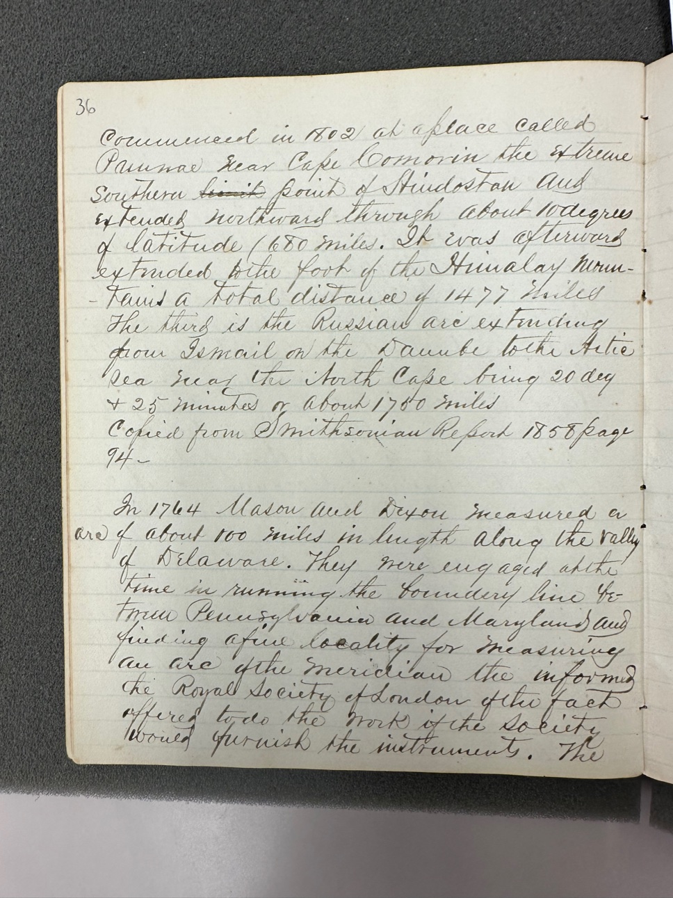 In 1764 Mason and Dixon measured a[sic] arc of about 100 miles in length along the valley of Delaware. They were engaged at the time in running the boundery[sic] line between Pennsylvania and Maryland and finding a fine locality for measuring an arc of the meridian the[sic] informed the Royal Society of London of the fact offered to do the work if the society would furnish the instruments. The