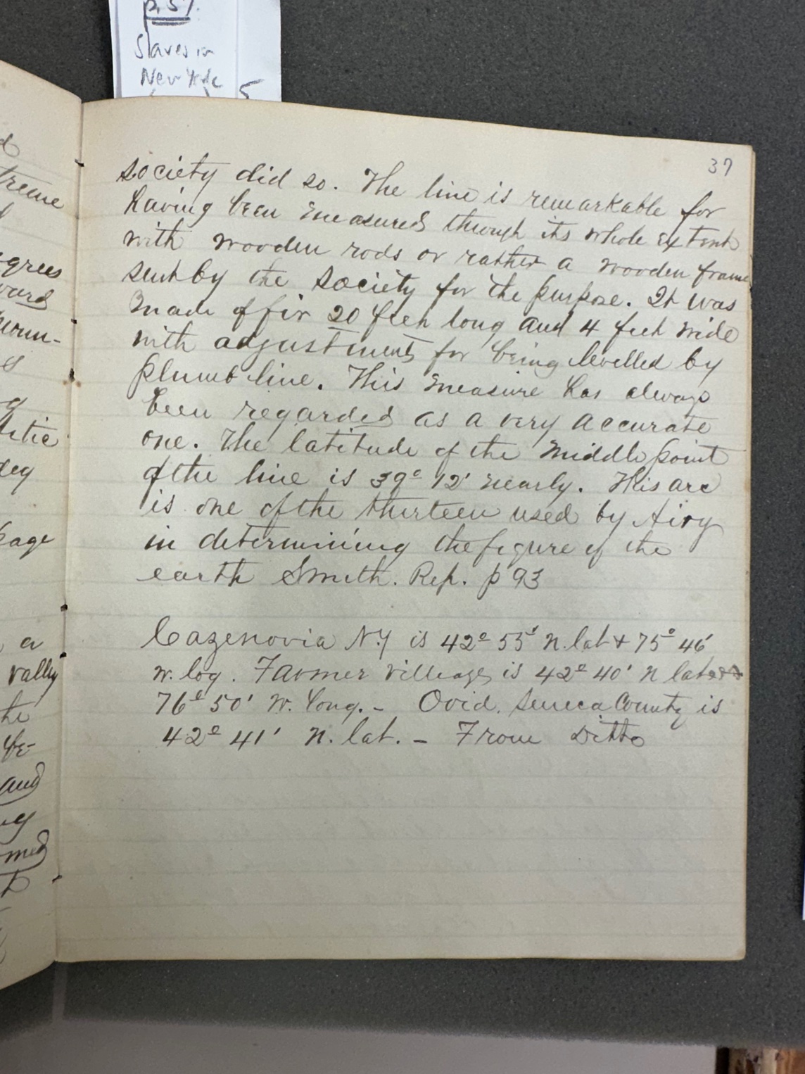 Cazenovia N.Y. is 42°53′ N.lat + 75°46′ W.log. Farmer Villiage[sic] is 42°40′N latitude 76°50′ W. long. Ovid Seneca County is 42°41′ N. lat._ From ditto.